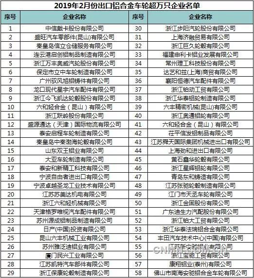 2019年2月,中國鋁合金車輪共計出口110個國家和地區,數量≥1萬只的有30個具體數據見下表: